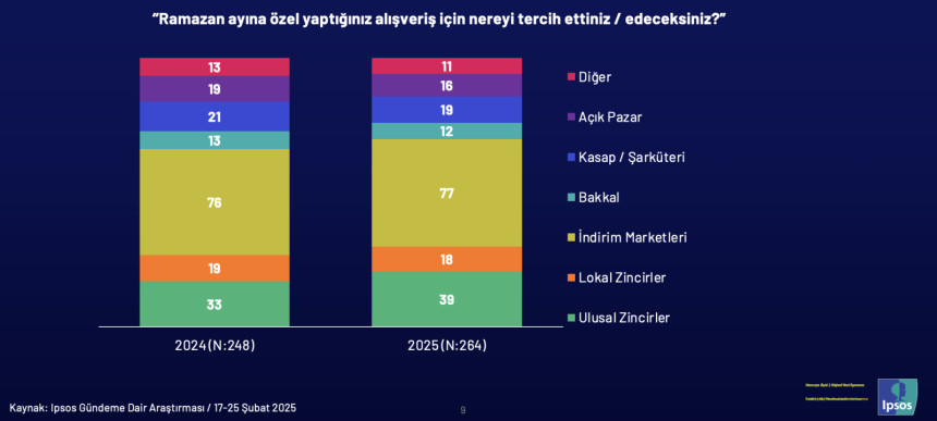 Geçen sene olduğu gibi bu sene de Ramazan ayı için alışveriş yapan ya da yapmayı düşünen kişilerin en çok tercih edeceği kanal, indirim marketleri. Ulusal zincirler ikinci sırada tercih edilen kanal ve 2025 yılında daha fazla tercih edildiği görülüyor.