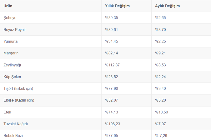 Temel tüketim maddeleri içinde fiyat artışı ilk sırada yüzde 112,87 ile zeytinyağında ikinci sırada ise yüzde 106,23 ile tuvalet kağıdında oldu. Geçen yılın temmuz ayına göre beyaz peynir fiyatı yüzde 89,61, yumurta yüzde 34.45, bebek bezi yüzde 77,95, kadın elbisesi yüzde 52,07 erkek tişörtü yüzde 77,90 oranında arttı.
