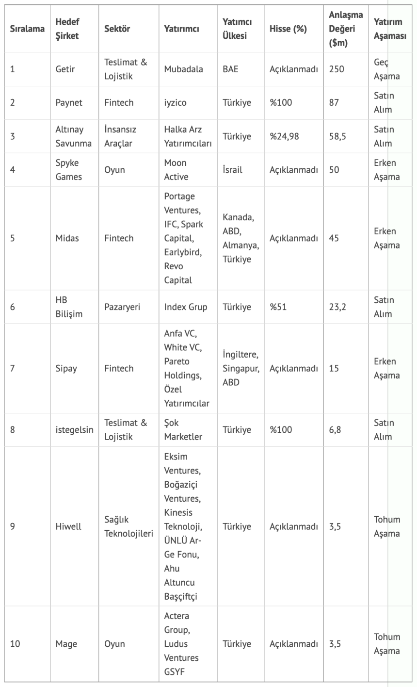 Kullanıcılarına cazip komisyon oranlarıyla yatırım yapma imkânı sunan yatırım uygulaması Midas, Kanada menşeili Portage Ventures liderliğinde gerçekleşen A serisi yatırım turunda 45 milyon dolar yatırım aldı. Yatırım turuna International Finance Corporation (IFC), Spark Capital, Earlybird Digital East Fund ve Revo Capital da katıldı. Finansal teknolojiler alanında uçtan uca hizmet sunan Sipay ise Anfa VC liderliğinde, White VC ve Pareto Holdings katılımıyla 15 milyon dolar yatırım aldı.