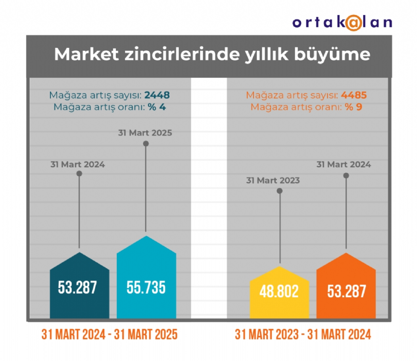 “Son 16 yıldaki en düşük ilk çeyrek büyümesi gerçekleşti”Ortakalan Market Araştırmaları’nın son bir yıldaki verilerine göre şube sayısı en az 5 ve üzerinde olan discount, ulusal ve yerel market zincirlerinin 31 Mart 2024’te 53 bin 287 olan toplam mağaza sayısı yüzde 4 artışla 55 bin 735’e yükseldi. Son bir yılda toplam mağaza artışı ise 2 bin 448 olarak ölçüldü. 31 Mart 2023 – 31 Mart 2024 aralığında önceki 1 yıllık verilerde market zincirlerinin toplam mağaza sayısı yüzde 9’luk artışla 48 bin 802’den 53 bin 287’ye yükselmişti. Bir önceki yıllık toplam mağaza artışı ise 4 bin 485 olmuştu.