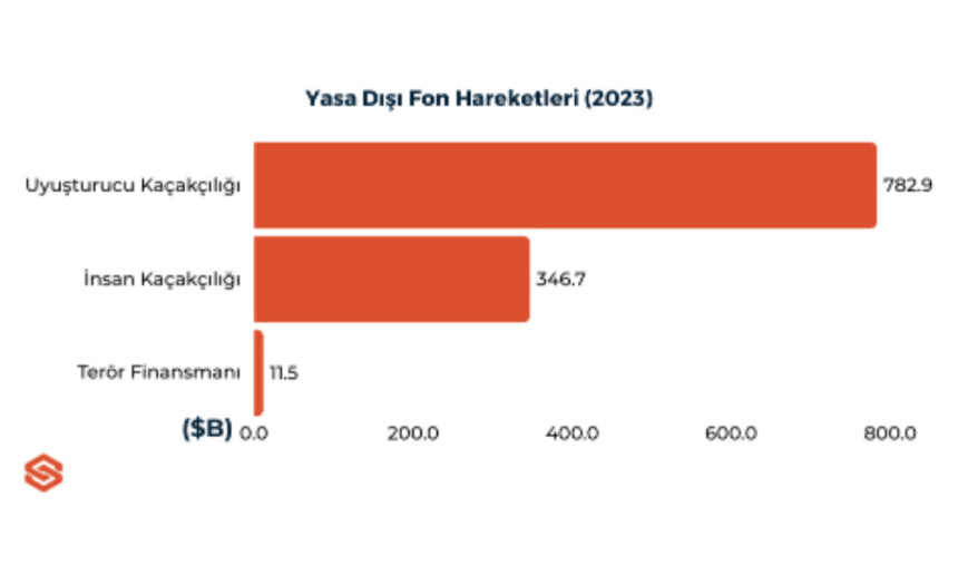 - Bunun 782.9 milyar doları uyuşturucu kaçakçılığı, 346.7 milyar doları insan kaçakçılığı, 11.5 milyar doları ise terörün finansmanı kaynaklıdır.