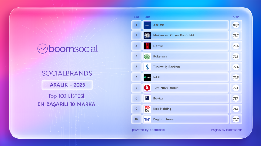 Aselsan, savunma sanayiindeki teknolojik kabiliyetlerini öne çıkaran düzenli paylaşımlarıyla bu ay da güçlü bir iletişim performansı sergiledi. Tüm platformlarda yüksek etkileşim yakalayan marka, SocialBrands Aralık Ayı Top100 listesinin zirvesine adını yazdırdı.
