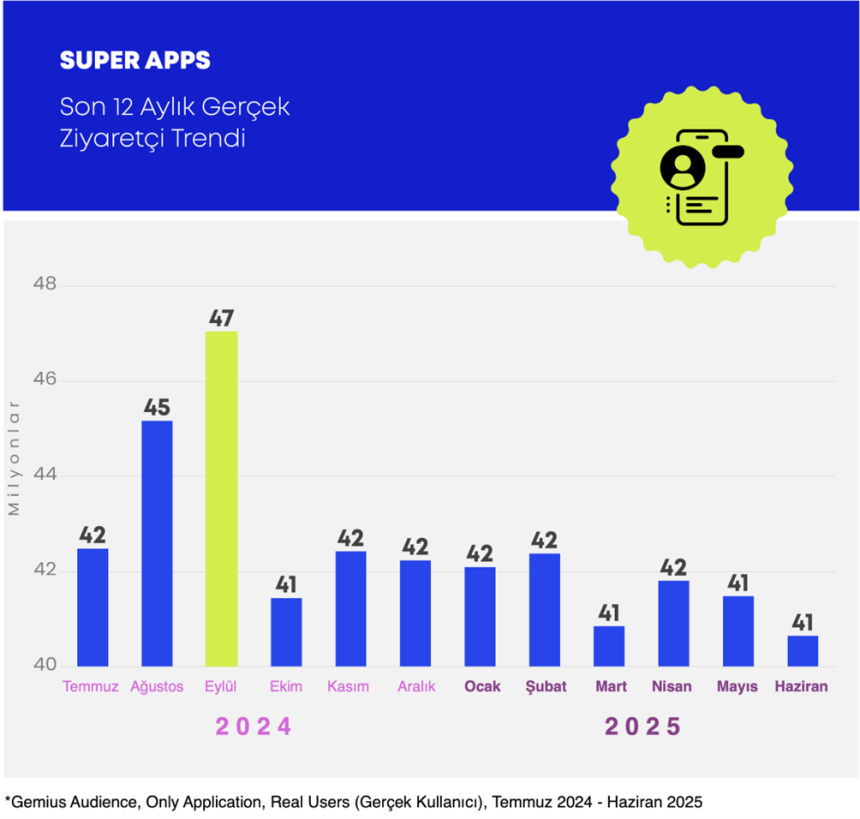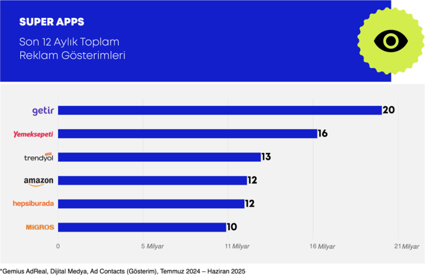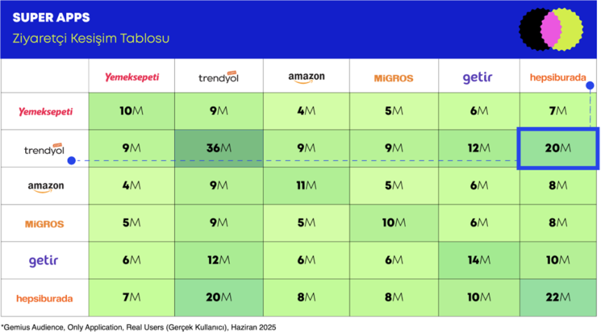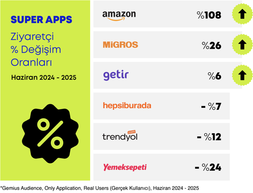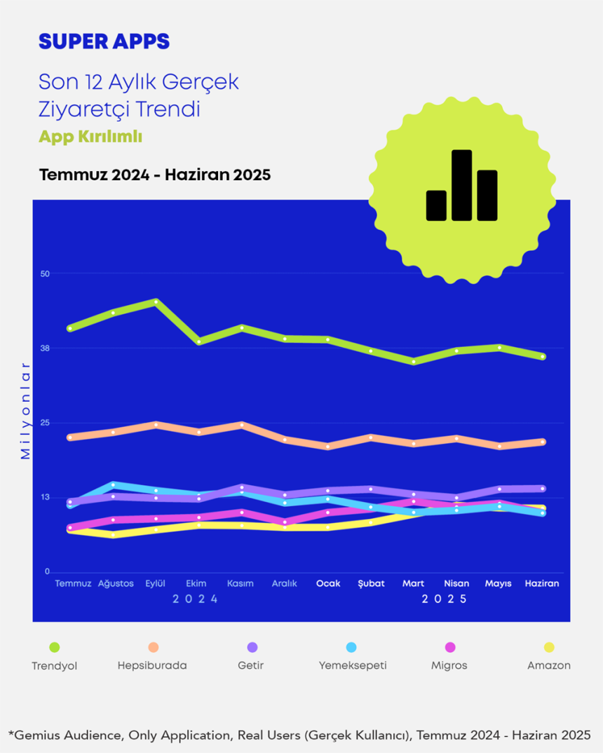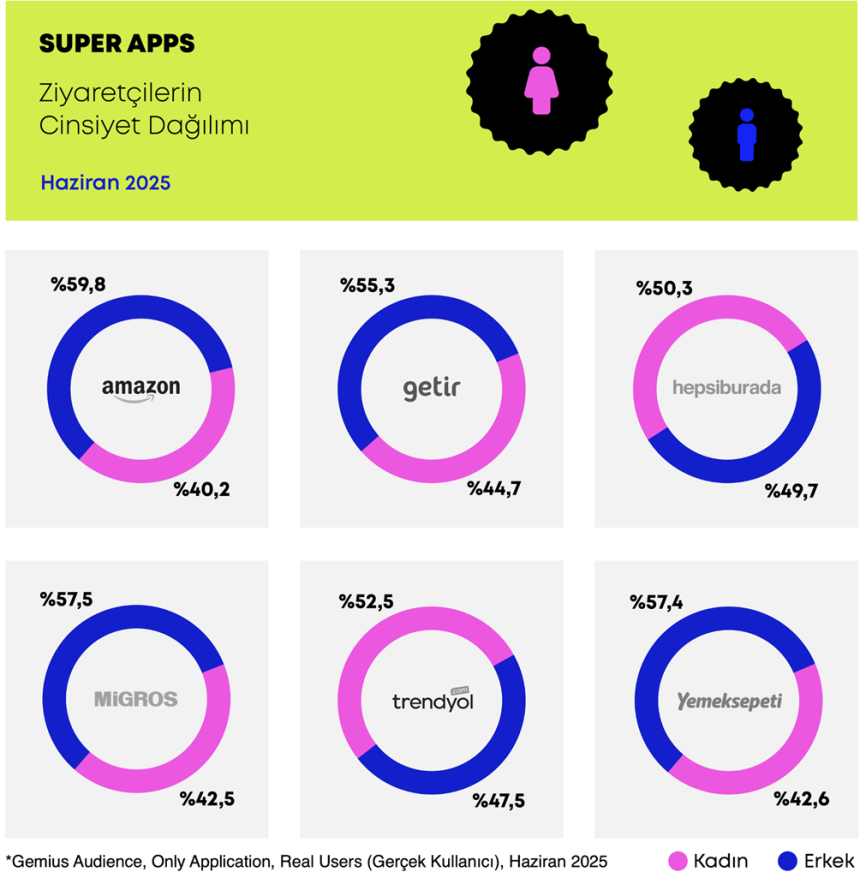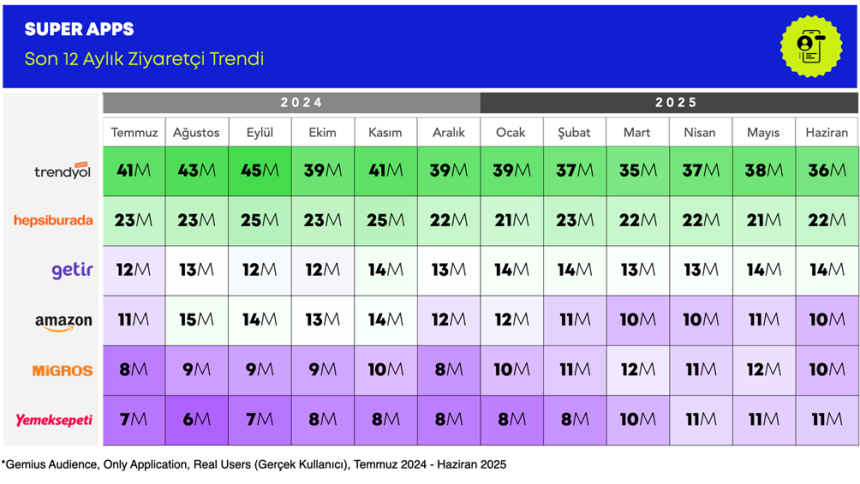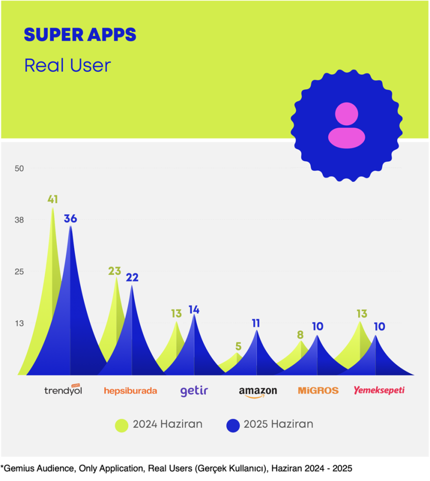 Gemius Türkiye’nin Temmuz 2024 – Haziran 2025 verilerine dayanan analizine göre; Trendyol, Getir, Hepsiburada, Migros, Amazon ve Yemeksepeti gibi yerli ve global oyuncuların süper app stratejileri dikkat çekici sonuçlar veriyor. Öyleyse sözü rakamlara bırakalım…