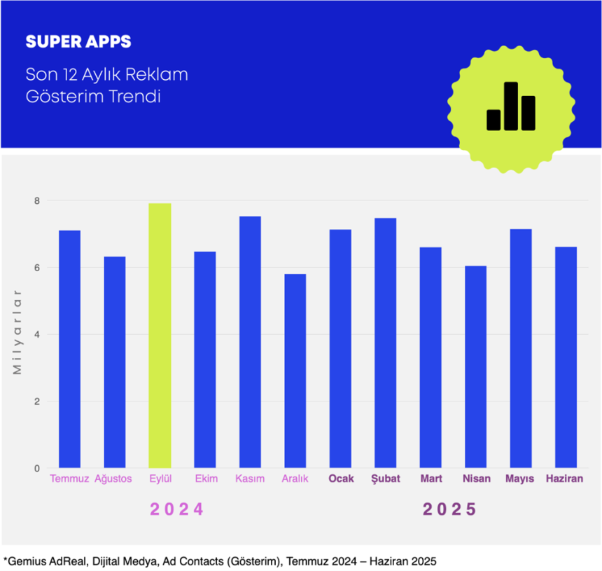 Reklam gösterimi de Eylül’de zirveyi gördüGemius Adreal’ın verilerine göre süper app’lerin son 12 aylık reklam gösterim trendiğini mercek altına aldığımızda Back to School döneminde reklam gösterimlerinde zirveye ulaşılırken, en zayıf ay ise Aralık oldu.