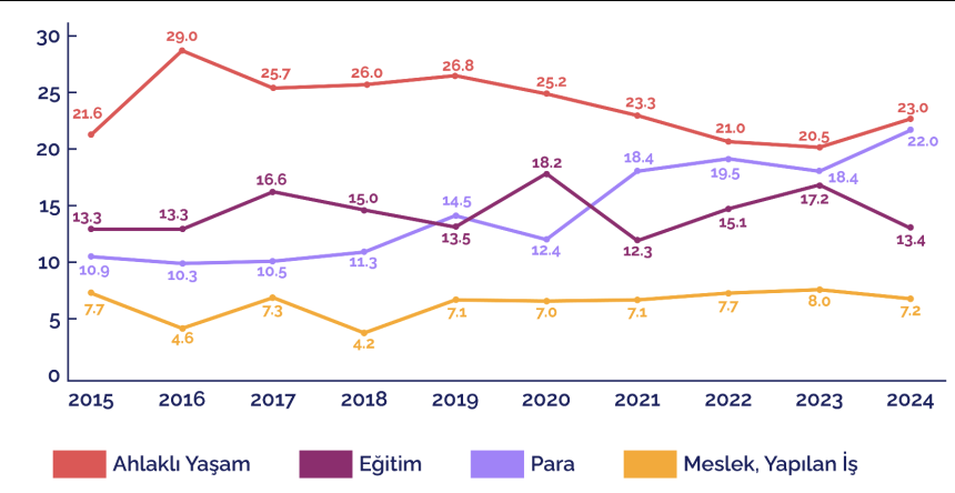 Biz de TÜİK'in kullandığı bazı “itibar unsurlarını” merceğimize aldık ve 18-24 yaş arasındaki gençlerdeki son 10 yıllık değişimi inceledik ve itibarın her geçen yıl parayla somutlaştığını gördük. Manevi bir değer olan “Ahlak” yakın zamanda üstünlüğü paraya kaptıracak gibi görünüyor. Ahlakın itibarın en önemli göstergesi olduğunu düşünenler halen zirvede, fakat son 10 yıllık trendde anlamlı bir değişim yok. Diğer taraftan 1. Sıraya parayı koyanların oranı son 10 yılda 2 kat artarak %11’den %22’ye ulaştı. Diğer bir ilgi çekici sonuç ise eğitim ve kariyerde herhangi bir değişim olmaması. Eğitim ve kariyer gençlere göre sosyal statü aracı olmaktan uzaklaşıyor olabilir. Paradaki anlamlı yükselişin eğitim ve kariyer ile pek ilişkili olmaması gençlerin bir bölümünde paranın hangi şekilde kazanıldığından bağımsız bir şekilde itibar sağladığına işaret ediyor.