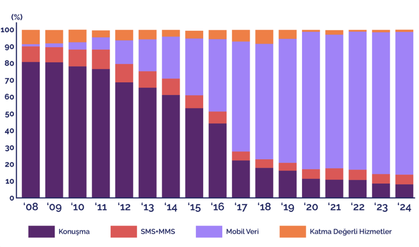 2008'de mobil gelirlerinin %81'i 'konuşma'dan geliyordu, 2024'te %85'i 'data'dan oldu.