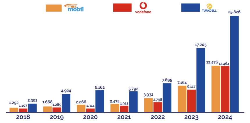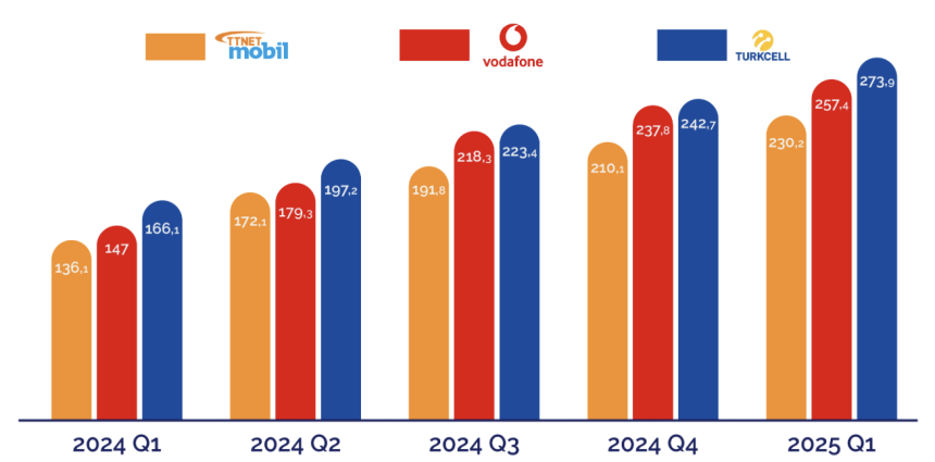 2025/1Ç itibarıyla Turkcell 274 TL, Vodafone 257 TL, TT Mobil 230 TL. Enflasyonist ortamda reel gelirler de artış eğiliminde; operatörler gelirini büyük ölçüde veri tüketimi ve tarife güncellemeleriyle tutuyor.
