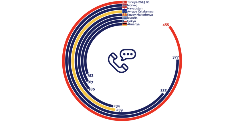 2025/1Ç’te Türkiye’de mobil hat başına aylık ortalama 455 dakika (yaklaşık 7,6 saat) görüşme var; listelenen Avrupa ülkeleri arasında zirvedeyiz. Mesajlaşma ve veri patlamasına rağmen ses konuşma da yüksek.