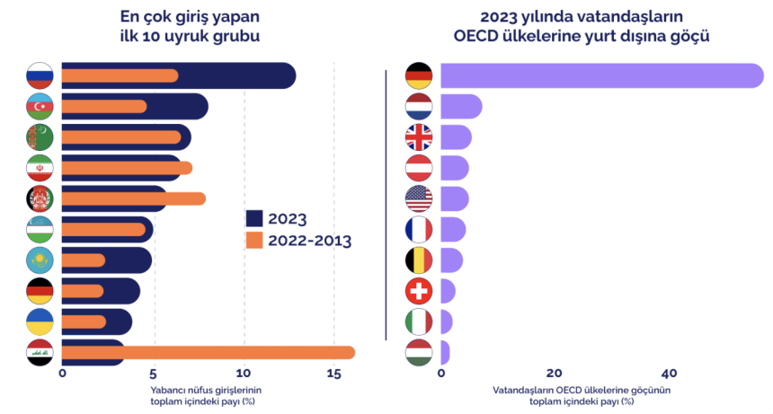 Tablonun diğer yüzünde ise Türkiye’den gidenler var. 2023’te OECD ülkelerine göç eden Türkiye Cumhuriyeti vatandaşlarının sayısı bir önceki yıla göre %37 artarak 158 bine çıktı. Bu grubun %57’si Almanya’ya, %7’si Hollanda’ya, %5’i ise Birleşik Krallık’a yerleşti.