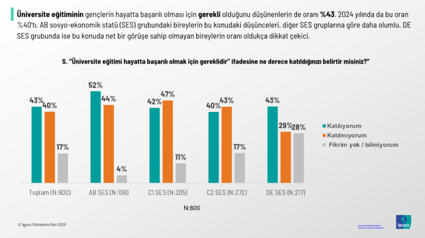 İş hayatına geçmeden önceki son durak olan üniversite konusunda farklı görüşler var. Üniversite eğitiminin gençlerin hayatta başarılı olması için gerekli olduğunu düşünenlerin de oranı yüzde 43. AB sosyo-ekonomik statü (SES) grubundaki bireylerin bu konudaki düşünceleri, diğer SES gruplarına göre daha olumlu. Bu SES grubunda her iki kişiden biri üniversite eğitiminin hayatta başarılı olmak için gerekli olduğu düşüncesinde. C1,C2 ve DE SES gruplarındaki bireylerde ise olumlu bakış açısı azalıyor.