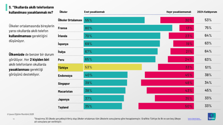 Teknolojinin eğitimdeki rolü de tartışmaların merkezinde. Uluslararası düzeyde bireylerin yarısı, okullarda akıllı telefonların yasaklanması gerektiğini savunuyor. Türkiye’de de tablo farklı değil: Her iki kişiden biri bu görüşü destekliyor.