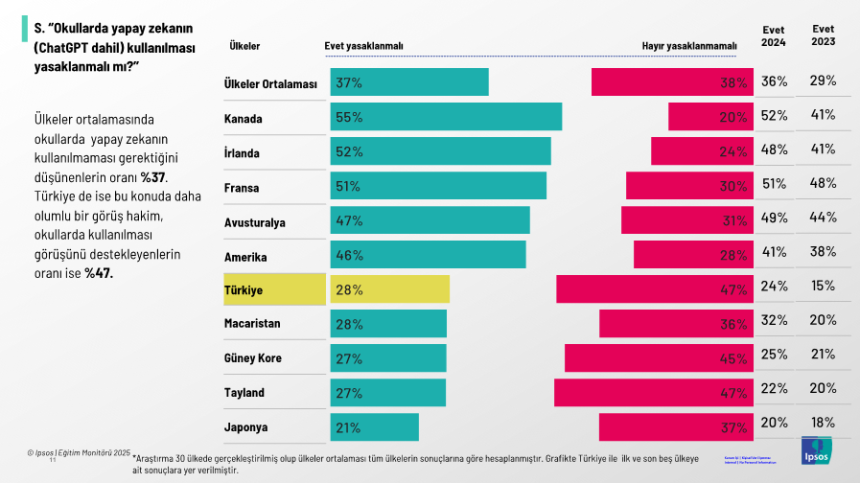 Öte yandan, yapay zekaya bakış daha olumlu. Küresel ortalamada yüzde 37’lik bir kesim okullarda yapay zekanın kullanılmaması gerektiğini düşünürken, Türkiye’de yüzde 47’lik bir kesim tam tersine yapay zekanın eğitim ortamında yer alması gerektiğini savunuyor.