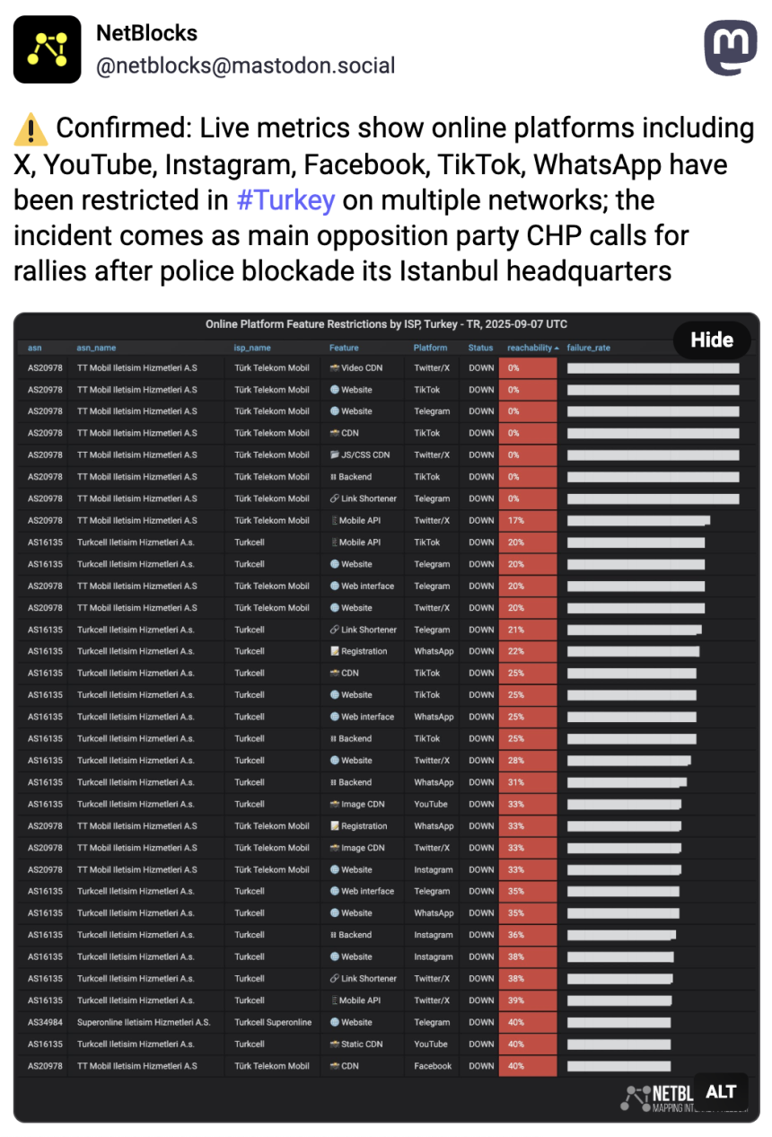 Dünyada internet kısıtlamalarını takip eden NetBlocks ise, CHP İstanbul İl Başkanlığı’nın polis ablukası altına alınması ve devam eden süreç sonrasında Türkiye’de birçok sosyal medya platformuna kısıtlama getirildiğini bildirdi.