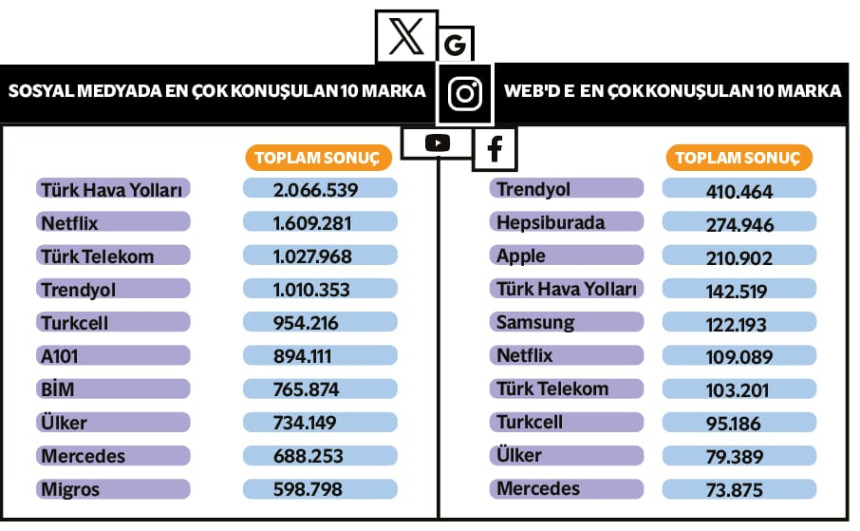 Dijital dünyada en çok konuşulan marka sıralamasında bu yıl ilk sırayı Türk Hava Yolları alırken, geçen yılın birincisi Netflix bu yıl listeye ikinci sıradan girdi. 2022 yılında 18’inci sırada yer alan Trendyol büyük bir başarı göstererek 2023’te en çok konuşulan üçüncü marka olarak listeye adını yazdırdı.