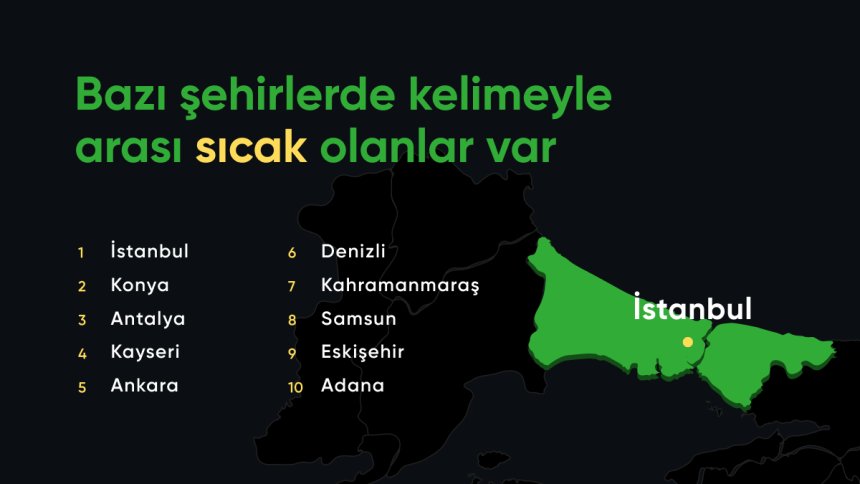 Peki en çok kimler oynuyor bu oyunu? Harita bize şöyle söylüyor: İstanbul, Konya, Antalya, Kayseri, Ankara, Denizli, Kahramanmaraş, Samsun, Eskişehir ve Adana, Wordle tutkusunu en çok yaşayan şehirler arasında. Her biri kendi kelimesini kovalamakta kararlı.