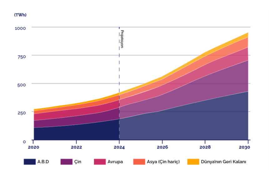 ABD ve Çin başı çekiyorElektrik tüketiminin coğrafi dağılımı da dikkat çekici: 2030’a gelindiğinde ABD ve Çin’in toplam tüketimin yüzde 75’ini gerçekleştireceği öngörülüyor.