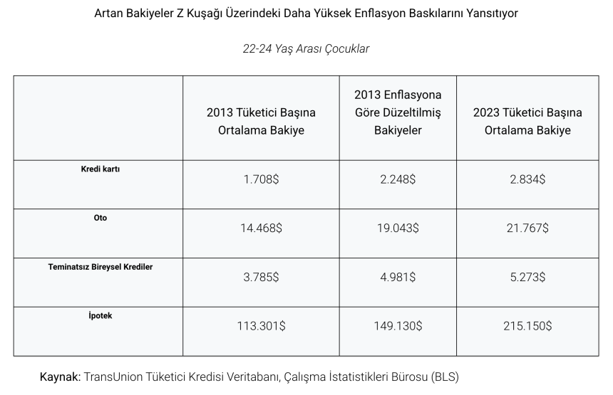 Z kuşağı tüketicilerinin kart kullanımındaki artış sadece bu demografiye özgü değil; zira tüketiciler bir bütün olarak son on yılda, özellikle de son yıllarda, enflasyondaki önemli ve kalıcı büyümeyi yönetmek için kredi kartlarını daha fazla kullanıyor. 2013'ün 4. çeyreğinden bu yana, tüketici fiyat endeksi kümülatif olarak %32 arttı ve bu durum birçok tüketiciyi, artan maliyetlere yardımcı olmak için kredi kartlarını finansal bir dayanak noktası olarak kullanmaya yöneltti. Yakın zamanda yayınlanan bir TransUnion raporu, artan kullanım nedeniyle ABD'li tüketicilerin elindeki toplam kredi kartı bakiyesinin 2023'te ilk kez 1 trilyon doları aştığını ortaya çıkardı. Artan kredi kartı bakiyelerine ek olarak, yüksek fiyatlar Z kuşağının bakiyelerinin artmasına katkıda bulundu. Taşıt kredileri de dahil olmak üzere diğer kredi ürünlerindeki tüketicilerin oranı, enflasyona göre düzeltilmiş 2013 ortalama bakiyelerine kıyasla 2023'te %14 arttı.